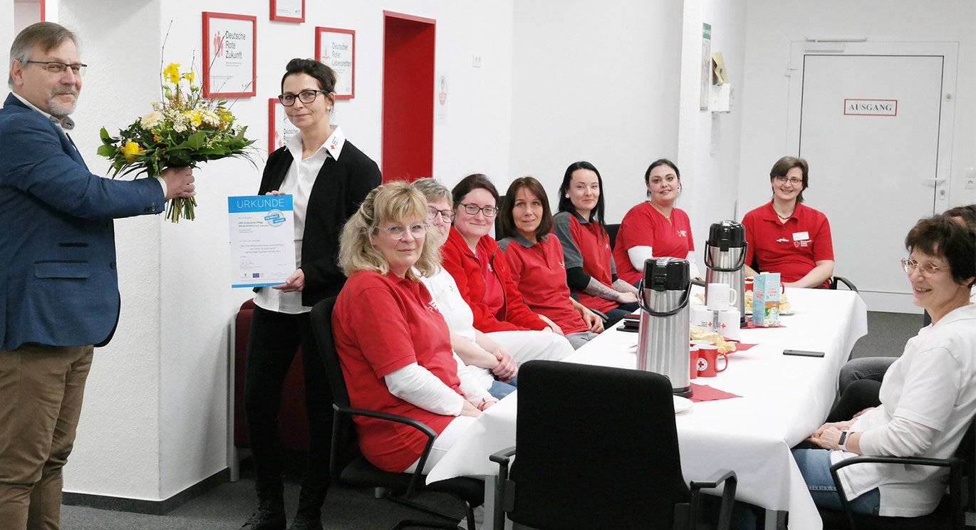 La 17 martie 2022, echipa de la DRK Ambulante Pflege GmbH Haldensleben a primit sigiliul de stat "Compania orientată către angajați - mă simt bine aici" din partea consultantului nostru regional de afaceri André Gottschalk. Doamna Petra Schulze, șefa asistentei medicale, a primit certificatul în numele întregii echipe. Întreaga echipă a fost foarte mândră de ceea ce a realizat. Unitatea din Haldensleben se caracterizează în special printr-o comunicare foarte bună și o echipă foarte unită. Sigiliul de stat a fost sărbătorit cu cafea și prăjituri.